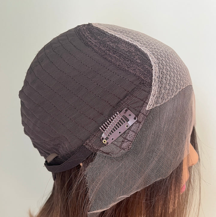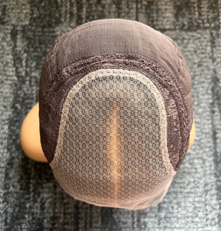CAP CONSTRUCTION 4x4.75" lace parting area with a soft net liner, ear-to-ear lace front, close wefted back and sides, ear tabs with clips, extended nape with comb above, adjustable straps at the nape. The net liner, clips and comb can be removed on request.