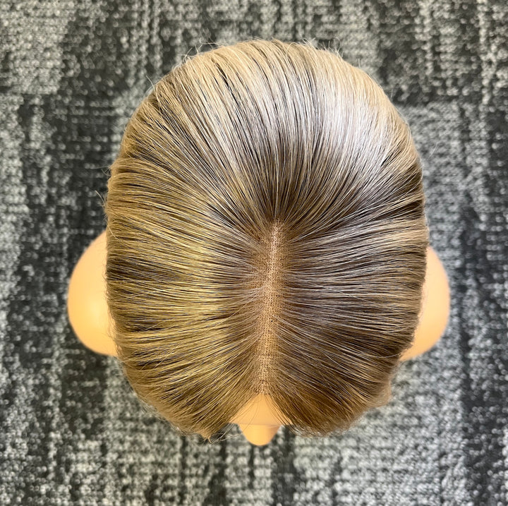 BASE & PARTING 4.5x5” base with 3x3" hand-tied lace parting area, closed lace front and closed wefts at the back and sides, 5 pressure-sensitive clips. NOTE: you might find that once you have moved the hair into your chosen parting, you need to add a clip at the hairline to ensure the front of the topper lies flat (we include 2 spare clips with your purchase)