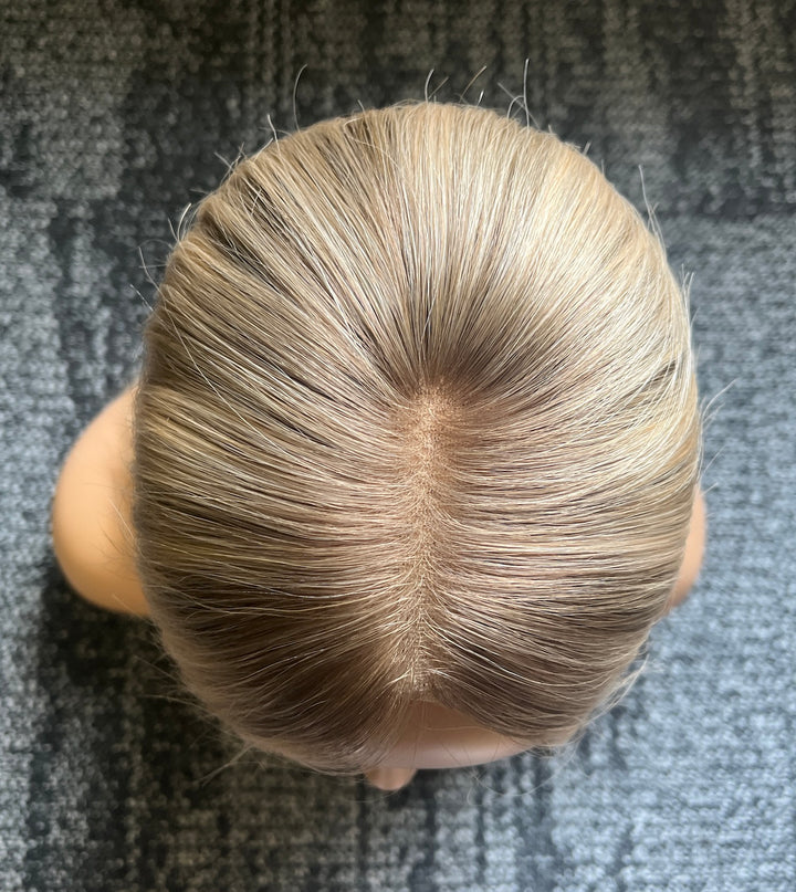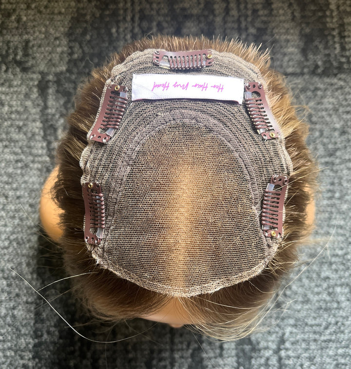 BASE & PARTING 4.5x5” base with 3x3" hand-tied lace parting area, closed lace front and closed wefts at the back and sides, 5 pressure-sensitive clips. NOTE: you might find that once you have moved the hair into your chosen parting, you need to add a clip at the hairline to ensure the front of the topper lies flat (we include 2 spare clips with your purchase)