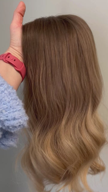 BRAND Her Hair My Head COLLECTION Luxury wigs NAME Ella COLOUR Ashy light brown/dark blonde base fading to a creamy blonde with light blonde highlights. Photos shown in indoor lighting...