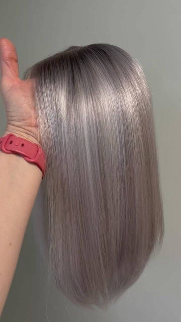 COLOUR Light grey 2” root fading into a mix of light ashy blonde, white and light grey.