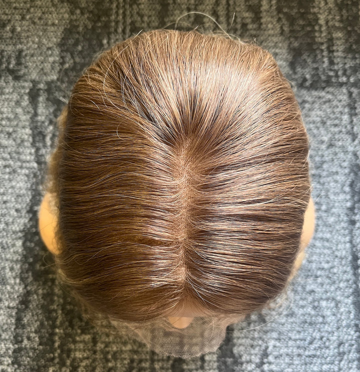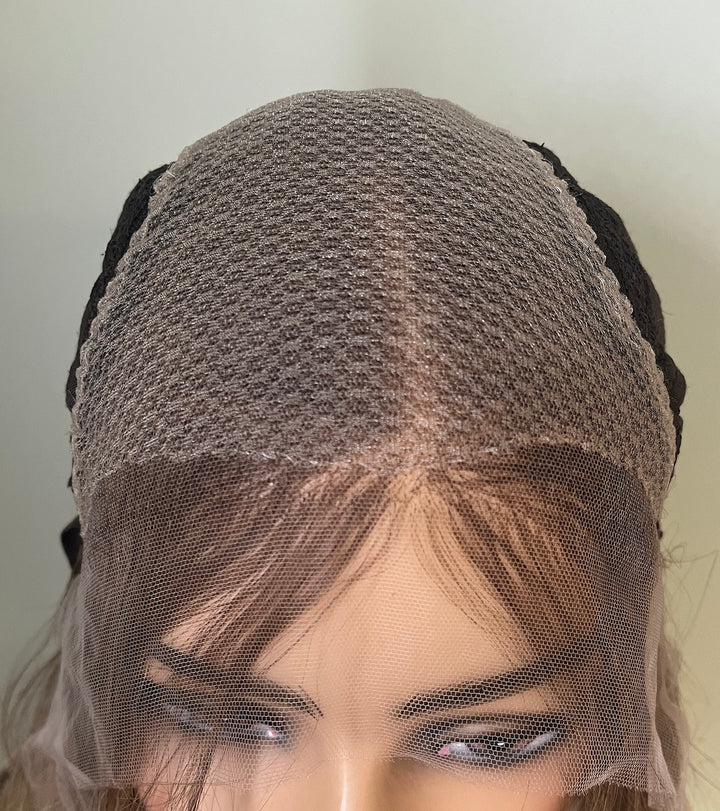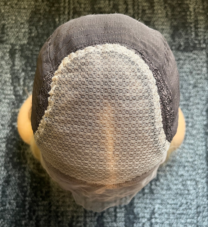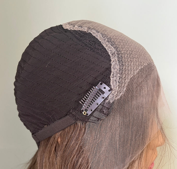CAP CONSTRUCTION 4x4.75" lace parting area with a soft net liner, ear-to-ear lace front, close wefted back and sides, ear tabs with clips, extended nape with comb above, adjustable straps at the nape. The net liner, clips and comb can be removed on request.