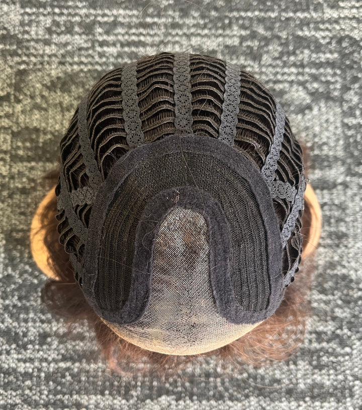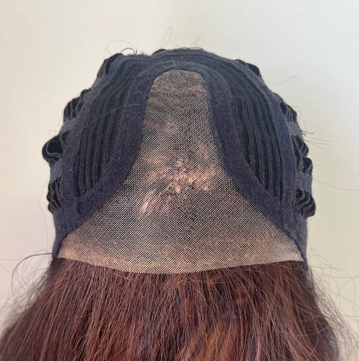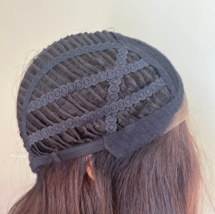 WIG CONSTRUCTION Temple-to-temple lace front, part monofilament top (T-section; the rest of the top is close wefted), open-wefted back and sides, velvet ear tabs with metal stays, extended velvet nape, velcro adjustable straps at nape