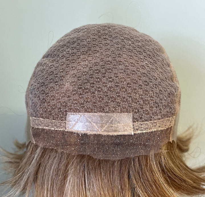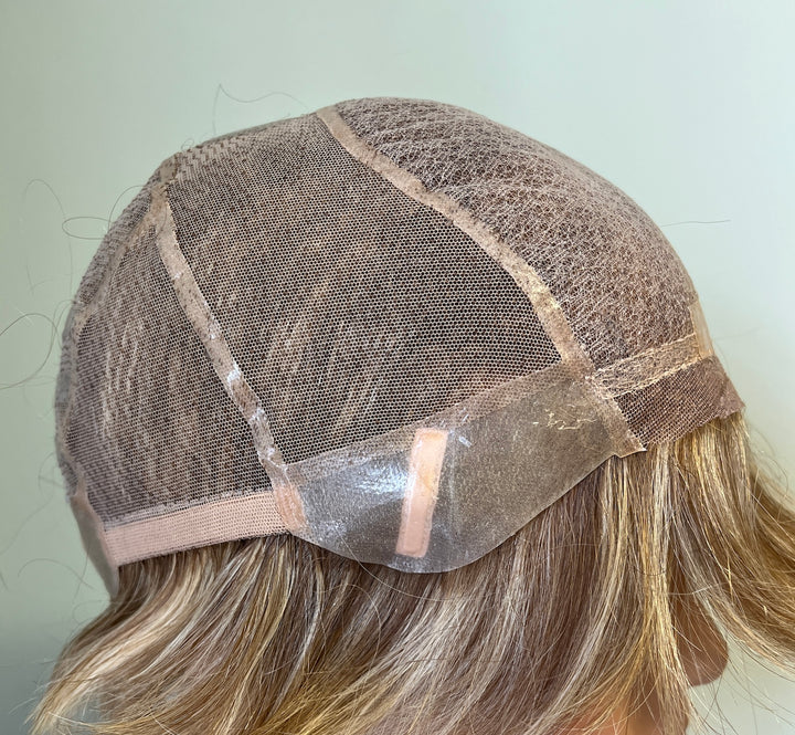 WIG CONSTRUCTION Temple-to-temple lace front, 5x5" multi-directional lace top parting area (lined), fully hand-tied cap. Extended nape fully coated with silicone (has metal stays), silicone-coated ear tabs with metal stays, three parallel strips of silicone at the back and 2x1" silicone tab at the crown.