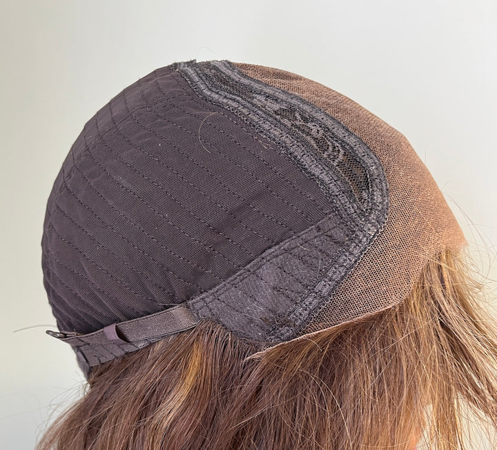 WIG CONSTRUCTION Ear-to-ear lace front, 4x5.5" multi-directional lace top parting area, close-wefted back and sides, velvet ear tabs with metal stays, extended velvet nape with comb (can be removed) and velcro adjustable straps at nape